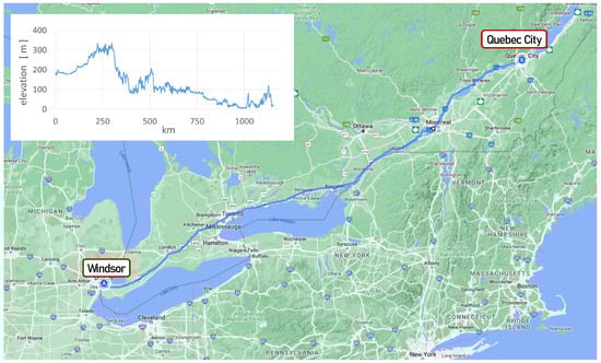 The simulation had the trucks going continuously back and forth between Windsor and Quebec City. If a truck happened to reach one end of the Windsor–Quebec City route part way through its daily driving duty, the simulation had the truck immediately turn around and continue the trip in the opposite direction. A map showing this route is provided in Figure 1, which follows Highway 401 in the province of Ontario, and continues on as Autoroutes 20 and 40 in the province of Quebec. The inset in Figure 1 shows the elevation profile of the route going from Windsor to Quebec City.