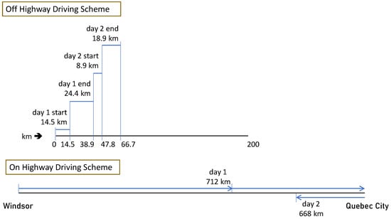 Schematic showing first two driving day distances for truck 490, for both the 200 km off-highway and the 1152 km on-highway virtual routes.
