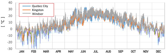 Hourly temperature data for three cities along the driving route taken by Environment Canada in 2020.