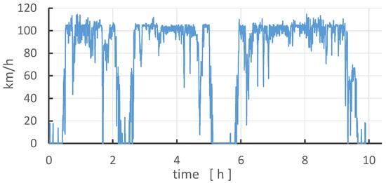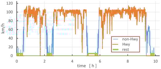 For these raw data-based duty cycles, three operational regimes were identified: rest periods, highway driving and non-highway driving. From the detailed data provided, it was elementary to identify rest periods. Data entries where road speed and engine rev values were both zero were set as rest steps. Some interpretation was required to distinguish highway steps from non-highway steps for times when the truck was in motion. An initial criterion was that any driving speed above 90 km/h could be considered as highway driving. This criterion alone allowed for brief momentary slowdowns to get classed as non-highway. An additional condition was to then identify the durations of these slowdowns. Based on the profile context, usually by visual inspection, an adjustable threshold value ranging from 400 to 700 s was set allow slowdowns shorter than the threshold value to be included with the highway driving. The results of this data conditioning exercise as applied to the same data as shown in Figure 5 are shown in Figure 6.