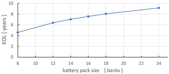 As anticipated, the pack lifetimes increase as a function of their size, primarily through the lower currents required and lower heat generation rates experienced to perform the driving duty. Lifetimes ranged from about 4.5 years for an 8-bank battery (534 kWh capacity) to over 9 years for a 24-bank pack (1600 kWh).