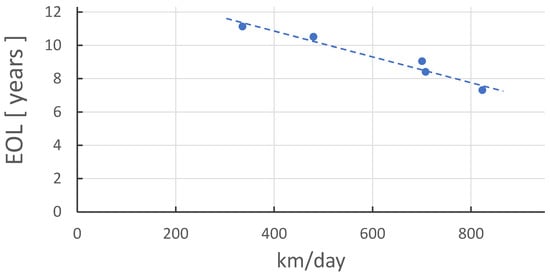 For each of the five trucks in the data set which were modeled as BETs with 24-bank batteries, their EOL values were plotted Figure 8 versus daily driving distance averages. The EOL value is seen to decrease with a higher average daily distance requirement, or for these cases, at a cost of 0.78 years per additional 100 km per day.