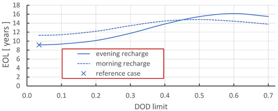 The functionality surrounding morning or evening recharging is somewhat complex. The general guiding principle here would normally be that recharging the battery to a very low DOD value would place it in a state where rest period degradation rates are high, so fully recharging a battery should best be carried out just immediately prior to beginning the day’s driving, reflected in Figure 9 with longer EOL values for morning recharging to low DOD levels. For high DOD limits, the rest state is moved from a near depleted DOD to one that is higher, thereby mitigating the DOD state driver for degradation []. Thus a crossover point between DOD limits 0.4 and 0.5 can be seen when comparing the morning and evening recharge curves. Analysis showed that the trucks were driving about 19.4% of the time, with the remaining 80% of the time spent at rest, thus underlining the importance of maintaining mid-level DOD values during rest to mitigate needless degradation.