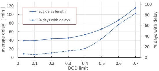 A series of simulations were run for 24-bank BETs where the minimum DOD permitted was controlled as a variable parameter. The minimum DOD value served as a cut-off point for stopping recharge operations. These simulations were carried out to establish suitable DOD operational ranges. Indeed, outside of a central range where the DOD value is known to mitigate degradation rates [], it is known in general that restricting the DOD to remain in a deep state of discharge may not allow sufficient energy for the driving duty to be completed without supplementary recharging, and rest state DODs may be non-ideal for battery preservation.