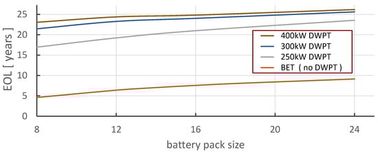 The same driving duty was simulated for e-trucks operating as EHTs, as was performed in Section 4.1 with BETs. The EOL values showing the average durability of all five trucks is plotted in Figure 11. All EHTs were able to operate right down to 60% SOH, and showed battery lifetimes upwards of 15 years, normally exceeding typical diesel long-haul truck lifespans. Comparing EHTs to BETs with equivalent battery capacities, significantly longer EOL values were observed. At = 250 kW with 8-bank packs, the EHT lifetime was about 4.6 times that of a BET, and with a 24-bank pack, this factor was 2.6. With at 300 kW, these factors were respectively 4.6 and 2.8, and 5.0 and 2.9 for = 400 kW. The EHT service lifetimes ranged from 80 to 90% of the battery calendar life (about 27 years) determined under the given environmental conditions, indicating that an e-truck operating mainly on an e-Hwy, could do so with very minimal battery degradation. In terms of operating cost for fuel or power [,], a heavy-duty transport truck would typically consume 40 L per 100 km, roughly $47 US at present day prices in Ontario, Canada, compared to about $16 US for 100 km for the e-trucks.