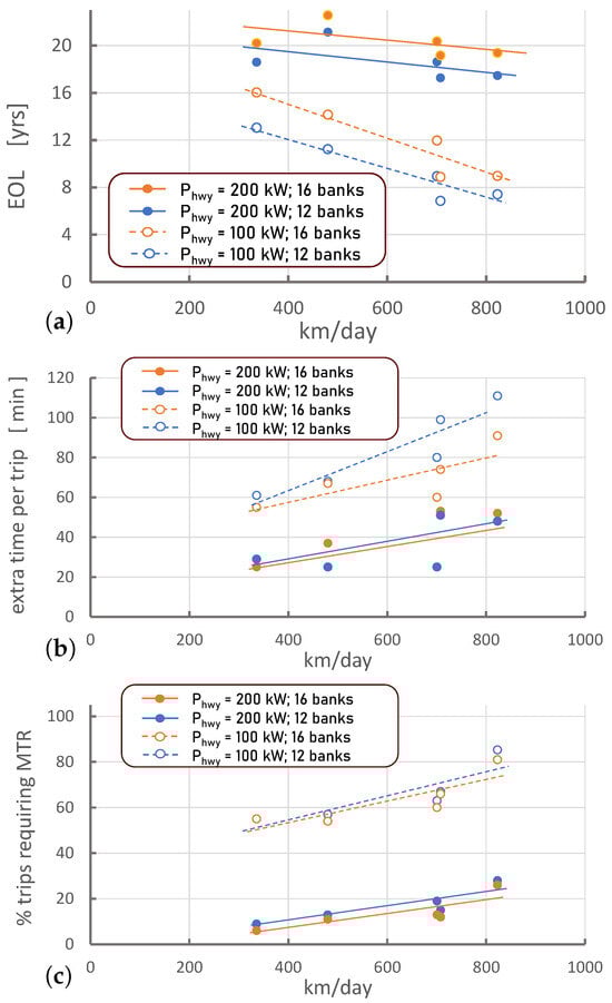 Lifetime characteristics of the five EHTs operating on low power e-Hwys where mid-trip recharging operations were permitted. Plots versus daily average driving distance: (a) EOL given in years, (b) in minutes per day, and (c) percentage of trips requiring mid-trip recharge.