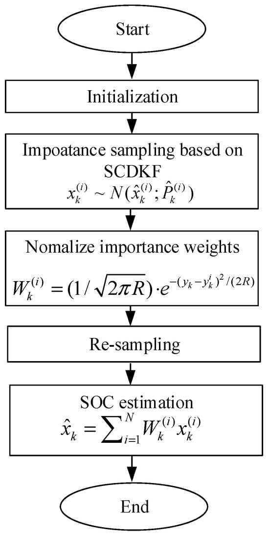 The SCDPF is an optimized PF method for SOC estimation which has a higher precision than the PF and the UPF methods [49]. It uses an SCDKF as an important density function to generate optimized particles to reduce the deviation between the sample and the actual sample. The Stirling interpolation formula is used for nonlinear approximation in the form of central difference, which leads to higher accuracy than that of the second-order Taylor expansion. The computational complexity is low because the Jacobian matrix of the system’s function does not need to be calculated. The square root form of the covariance matrix is used to ensure the positive definiteness of the covariance matrix, and the filtering performance is better than that of the UKF algorithm.