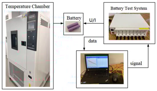 The ternary 21700 from Lishen battery Co., Ltd., Suzhou, China, with a rated capacity of 4.8 Ah and a rated voltage of 3.6 V, was applied for model parameterization and SOC estimation. This kind of battery has been widely used in many fields such as new energy vehicles, power tools, and so on because it has a high energy density, low cost, and is lightweight. As shown in Figure 3, the experimental platform consisted of a lithium-ion battery charge and discharge test system, a constant temperature chamber, an upper computer, and lithium-ion batteries. The temperature range of the high and low temperature test box was −40 °C~150 °C. The current acquisition accuracy was 0.001 A, and the voltage acquisition accuracy was 1 mV. The highest frequency of data acquisition was 50 Hz, the interval of data acquisition was 1 s; it supports CAN bus communication, and has many controllable modes, including constant voltage charging, constant current charging, constant current constant voltage charging, pulse charging and discharging, programmable power control, and dynamic condition simulation.