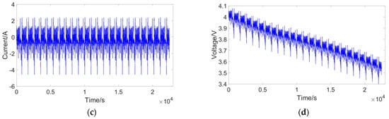 (a) Current in HPPC test; (b) voltage in HPPC test; (c) current in NEDC condition test; (d) voltage in NEDC condition test.
