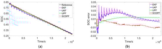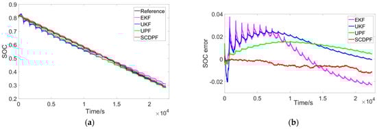 Figure 6 shows the results of the SOC estimation algorithms at 25 °C in comparison with the EKF [50], the UKF [51], the UPF [52], and the proposed SCDPF algorithm during NEDC test. The evaluation criteria used in the the SCDPF SOC estimation method are the smallest error and that the maximum error never exceeds 1.26. Therefore, the SOC estimation has a stronger tracking ability and higher accuracy.
