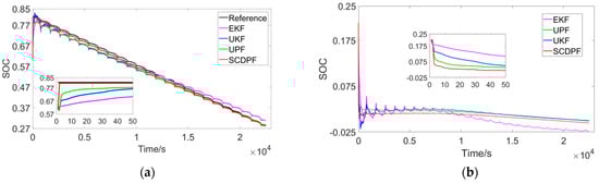 Convergence analyses of the different SOC estimation algorithms were conducted at the initial SOC values of 0.6 at 25 °C. The SOC values estimated by the four algorithms can quickly converge to the reference, as shown in Figure 8. The convergence rate of the SCDPF algorithm is faster than the three methods with a convergence time of 2 s. Figure 8b shows that the contrast of four algorithms is universal at the initial SOC of 0.6. The tracking trend of the SOC values is the same as that at the initial SOC of 0.8. The SOC estimation error obtained by the SCDPF algorithm varies slightly compared with that at the initial SOC of 0.8, which proves that the stability of the proposed algorithm is relatively higher.