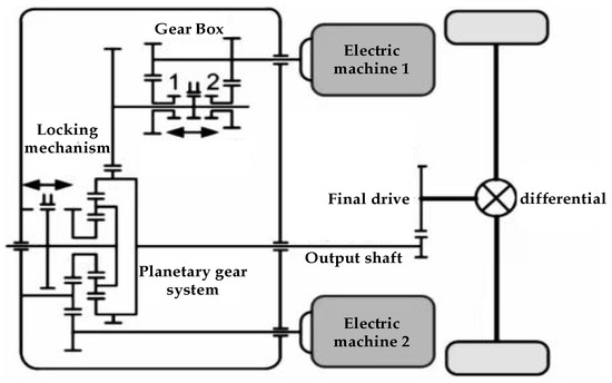 Figure 1, which consists of a planetary gear system, two-gear gearbox, electric machine 1, electric machine 2, and so on.