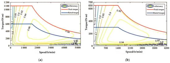20]. Therefore, motor 1 can be considered as a preferred choice. When the transmission is in the second gear, when the velocity is less than 28 km/h, motor 2 is more efficient; when the velocity is more than 49 km/h, motor 1 is more efficient; and when the velocity is between 28 and 49 km/h, both motor 1 and motor 2 are relatively efficient, considering that the demand torque of the vehicle in the middle and high-speed zone of 28~49 km/h on the high-gear position is smaller, at this time, the efficiency of the corresponding motor 2 is higher. Therefore, motor 2 can be considered as a preferred choice [