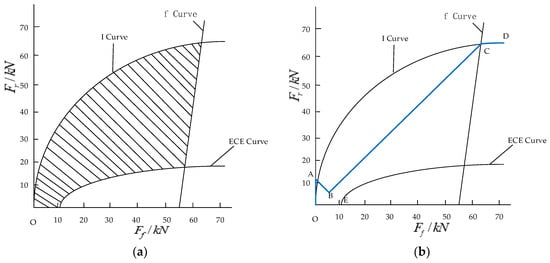 Figure 3b, point E is the intersection of the ECE curve and the horizontal coordinate axis and the coordinate of point E is calculated to be (10,999, 0) and the braking strength of point E is calculated to be 0.06. At point E, make a line at 45 degrees to the negative direction of the horizontal coordinate axis and intersect the vertical coordinate axis at point A. Point B is the intersection of this line and the line with
