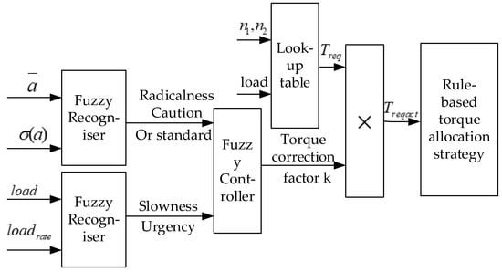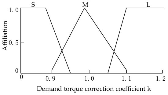 In Equation (8), is the actual driving demand torque of the vehicle, k is the torque correction coefficient, is a non-linear function about average acceleration, standard deviation of acceleration, accelerator pedal opening, and changing rate of accelerator pedal opening, is the maximum torque of motor 1 at speed , and is the maximum torque of motor 2 at speed .
