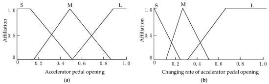 The affiliation functions of the accelerator pedal opening and the changing rate of the accelerator pedal opening are shown in