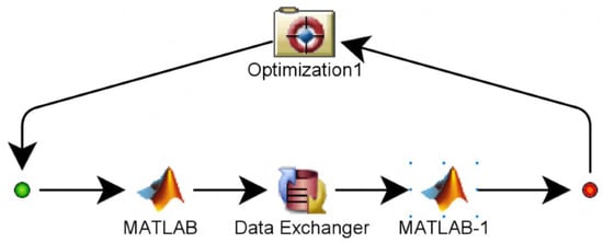 Isight optimization platform. Matlab: co-simulation of Simulink and Cruise; Data Exchanger: acquire test data; Matlab1: calculate optimization result.
