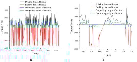 (a) The torque distribution after optimization; (b) The specific torque distribution between 456~520 s after optimization.