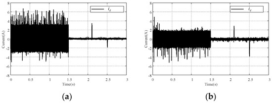 When using the short-pulse injection method, voltage signals of the same amplitude are injected along the positive and negative directions of the direct axis, and the voltage injection time for both is extremely short and equal. As shown in Figure 6a, after injecting a voltage pulse, the variation in flux linkage caused by both is the same, that is, the same . However, injecting a voltage pulse along the positive direction of the direct axis will increase the saturation of the direct-axis magnetic circuit and will reduce the saturation of the magnetic circuit and vice versa. Therefore, the two cause differences in the inductance of the direct axis, resulting in different amplitudes of the direct-axis current caused by positive and negative voltage pulses. If the magnetic pole position is correct, the current amplitude of the forward pulse increases due to the decrease in inductance, while the current amplitude of the reverse pulse is smaller than the forward current amplitude due to the almost constant inductance, which can be expressed as .