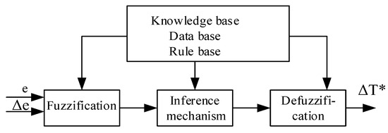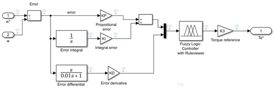 A model of a PID fuzzy controller is shown in Figure 5. It consists of the same PID controller as a fuzzy controller. A fuzzy controller has two inputs: the sum of proportional and integral errors composes one input, while the error derivative forms the other. The integral error usually has a small value [25,26]. A high-value integral error causes oscillations in the system, so it could be integrated with the proportional error constituting one fuzzy controller input.