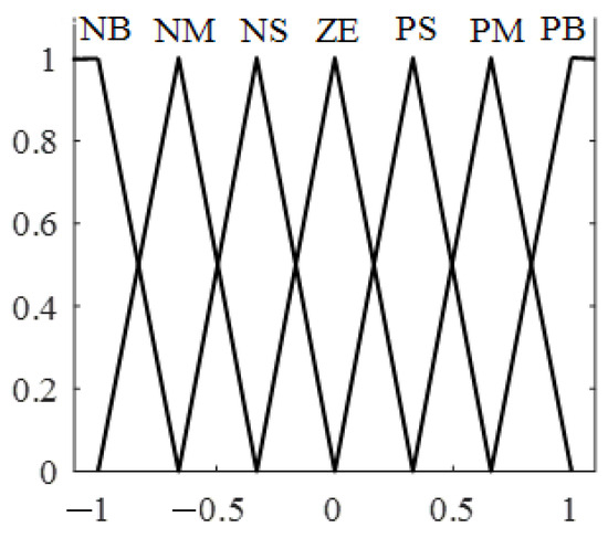 The fuzzy controller can control similar systems. The operation of a fuzzy logic controller is based on sets. Such a controller consists of a fuzzification block, the knowledge base, and the inference engine, as shown in Figure 2. The fuzzification block of a fuzzy controller transforms analogue inputs into fuzzy sets [29]. Seven linguistic variables related to the membership functions are used to describe these sets: PB (positive big), PM (positive medium), PS (positive small), ZE (zero), NS (negative small), NM (negative medium), and NB (negative big). The center of gravity method is used to calculate the output signal of fuzzy logic controllers.