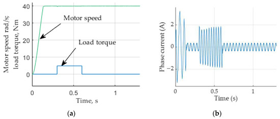 Figure 6b shows the motor phase current with step response. At the start, the greatest current value reaches 2.8 A. When the motor speed reaches a steady state, the phase current reduces up to 0.3 A; with the load applied at t = 0.3 s, it again rises to 1.8 A. After removing the load, the current returns to its steady-state no-load value.