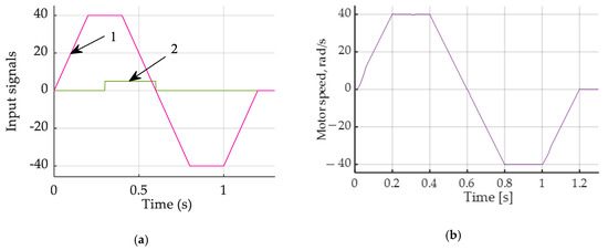 (a): Speed reference (1) and load torque (2); (b): motor speed.