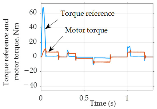 The reference torque produced by PID fuzzy controller output is amplified, developing a reference input of 22.3 Nm, which is much smaller than in the case of a PID controller, which is equal to 68 Nm (Figure 8).