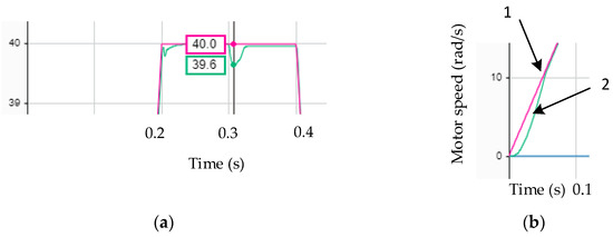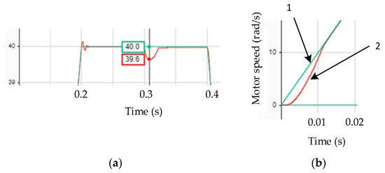 (a) Increased view of motor speed at load application, red color is for speed reference, green for actual speed; (b) difference between speed reference (1) and actual speed (2) at start.