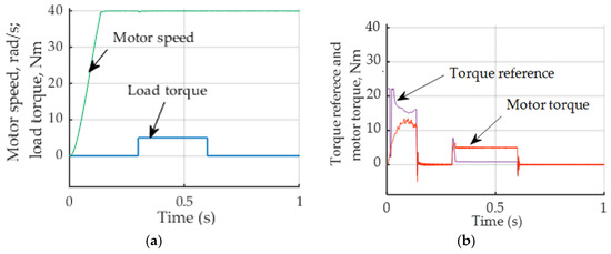Figure 12a presents an increased view of the motor speed at load application. This reduces by 1% and, after a brief time (0.012 s), is removed. The difference between the speed reference and actual speed at the start lasts 0.012 s (Figure 12b).