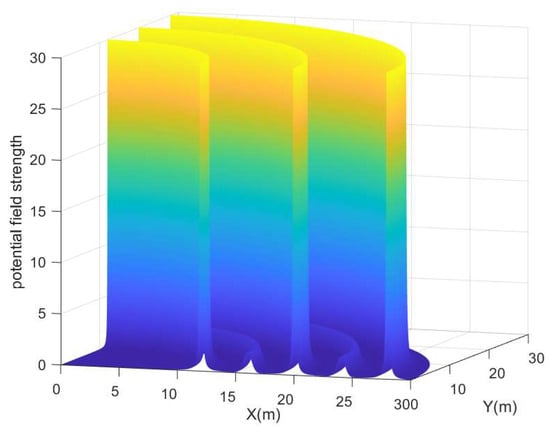 These two potential fields have specific roles in the vehicle traveling process. Moreover, the two potential fields are added together to obtain the total potential field of the road, as shown in Figure 2.