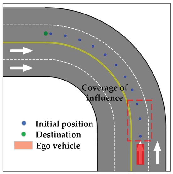 The gravitational potential field of the traditional artificial potential field method is generated by the target point, which is a single-point gravitational field. Excessive gravitational force is generated when the vehicle is far from the target. This reduces the strength of the obstacle-repulsive potential field and increases the risk of collision. Under steering conditions, such as right and left turns and curved roads, the direction of gravity is not consistent with the direction of road travel. The single-point gravitational field leads to vehicle planning failures, resulting in an unsafe factor. As shown in Figure 3, a single-point gravitational field cannot provide effective guidance for path planning in long-range target and steering conditions.