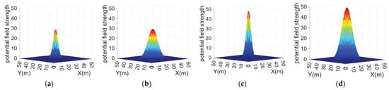 Distribution of obstacle-repulsive potential field for different parameters: (a) . (b) . (c) . (d) .