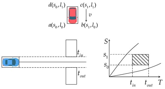 The S-T graph is a two-dimensional relationship graph with the longitudinal distance as the vertical axis and time as the horizontal axis. Based on a known reference curve, dynamic obstacles are mapped onto the S-T graph to obtain their projection. The principle of projection is that, when a dynamic obstacle intersects with the trajectory of the ego vehicle, it implies a collision with the ego vehicle. The time and path distance of the dynamic obstacle entering and leaving the trajectory of the ego vehicle are used as the projection range. The projected area represents the region of collision, which is the infeasible area. As shown in Figure 11, the blue vehicle represents the ego vehicle, while the red vehicle represents the dynamic obstacle; and are the longitudinal distances on both sides of the host vehicle and the dynamic obstacle, respectively; and are when dynamic obstacles drive into and out of the ego vehicle trajectory, respectively. The shaded area represents the region of collision, and the upper and lower lines represent different decision behaviors.