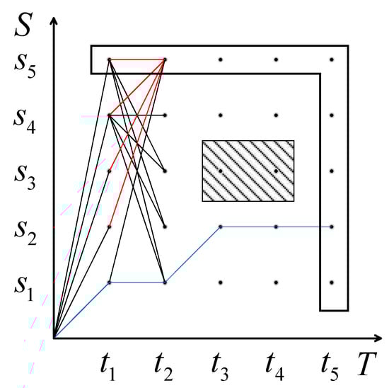 As shown in Figure 12, the S-T two-dimensional graph is discretized into equidistant points whose horizontal coordinates are time and whose vertical coordinates are longitudinal displacements. In the search process, starting from the calculation of the cost of each discrete point at the moment of , the calculation of the optimal path of each node is carried out sequentially in chronological order, and the optimal speed profile is finally obtained. The endpoint of the speed profile can be any node in the last row or column, and there is no need to take (,) as the endpoint. The blue line in Figure 12 shows the planned time versus longitudinal displacement below the collision range, i.e., the decision to slow down and avoid is made. Similarly, when the curve is above the shading, it represents that the vehicle moves out of the collision range earlier and decides to accelerate to overtake.