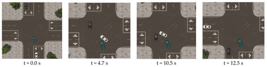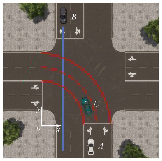 Urban roads have many intersections, which are formed by intersecting multiple structured roads. At the intersections, roadway boundaries need to be supplemented according to the driving intentions of the autonomous vehicles. This paper simulates and validates the dynamic and static obstacle avoidance capabilities of the algorithm under the uncontrolled intersection human left-turn condition. As shown in Figure 14, the initial position of ego vehicle A is (22, −8), with an initial speed of 5.5 m/s, and is located in the inside lane when making a left turn; the position of obstacle vehicle B is (2, 30), with a speed of 5.5 m/s, and is located in the outside lane, traveling straight ahead at a constant speed; the position of obstacle vehicle C is (21, 4.5), and is at a stationary state.