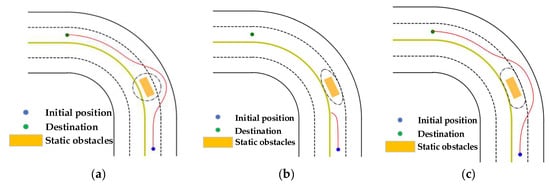 Figure 15 shows the planning situations under different ranges of the obstacle-repulsive potential field, respectively: the range of the repulsive potential field of the C-APF spans three lanes and completes the planning; the range of the repulsive potential field of the E-APF is not uniformly distributed within the driving lanes and falls into the local optimum, which prevents them from completing the planning; the range of the repulsive potential field of the DE-APF is uniformly distributed within the driving lanes, which avoids the local minima and completes the path planning.