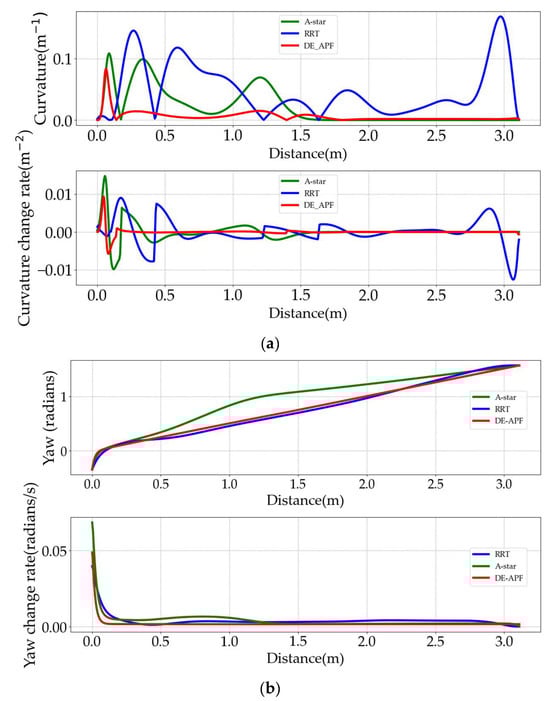 The path variations planned by the three algorithms are revealed in Figure 17. The average curvature of the paths planned by DE-APF, A-star, and RRT are 0.0062, 0.0202, and 0.0487, respectively. The average rate of change is 0.0002, 0.0010, and 0.0020, respectively. It can be seen that the paths planned by the DE-APF algorithm proposed in this paper are flatter. Due to the limitation of the working conditions, the yaw angle of the path needs to be changed from 0 degrees to 90 degrees. From graph b in Figure 17, it can be seen that the path planned by DE-APF changes smoothly, and the rate of change in the yaw angle of the path is nearly constant in the half section. In summary, the path planned by DE-APF can significantly improve the safety and comfort of autonomous vehicle travel.