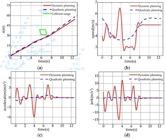 The results of planning under dynamic and quadratic planning: (a) S−T graph. (b) Speed of planning. (c) The state of acceleration. (d) The state of the first−order derivative of the acceleration–jerk.