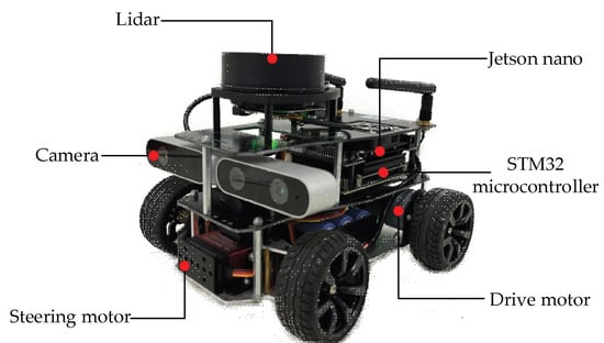 The experimental microvehicle shown in Figure 21 is equipped with a single line LiDAR (RPLIDARA1360) for detecting static obstacle position information, dynamic obstacle position and velocity information. The depth camera (IMX219-160) performs target detection and provides category and depth information. The STM32 microcontroller embedded with an Inertial Measurement Unit (MPU9250) provides linear and angular acceleration information in three directions. Real-time vehicle speed and position can be calculated by listening to the acceleration information. The computing platform (Jetson Nano) executes complex perception, decision-making, and control algorithms, extracting information from sensor data for target recognition, path planning, and motion control. The high-performance computing power and support for the Jetson Nano deep learning enable the intelligent microvehicle to respond faster and more accurately to environmental changes.