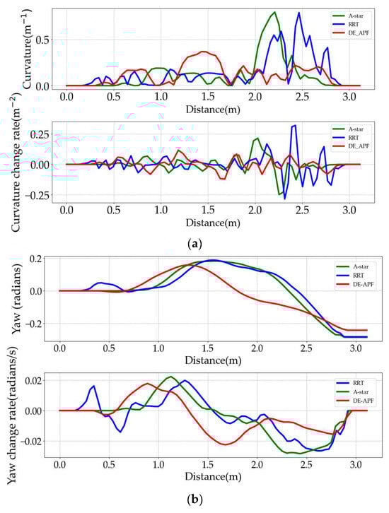 The path variations planned by the three algorithms are revealed in Figure 23. The average curvature of the paths planned by DE-APF, A-star, and RRT are 0.1148, 0.1249, and 0.1423, respectively. The average rate of change is 0.0306, 0.0356, and 0.0478, respectively. It can be seen that the paths planned by the DE-APF algorithm proposed in this paper are flatter. The trend of the yaw angle changes is roughly the same, with the DE-APF algorithm planning the smoothest path changes. Although there are significant angle changes, the frequency of changes is the lowest.