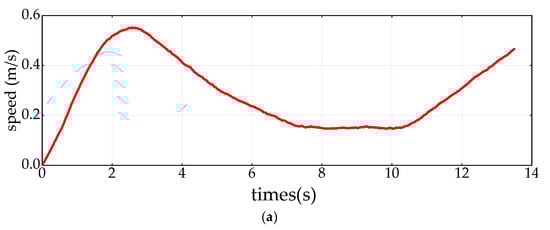 The experimental scene and working conditions are shown in Figure 20. The structured road sandbox can genuinely reflect the road’s lane lines and obstacle information. Static obstacles, dynamic obstacles, and destinations are set in the structured road of the sandbox. The dynamic obstacle accelerates from 0 m/s to 0.2 m/s at the location in the figure and then travels in the direction of the red arrow at a constant speed. The ego vehicle departs from the location in the figure at a standstill. It evades the static obstacle and performs speed planning to evade the dynamic obstacle and reach the destination.