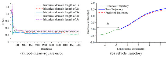 Curve of root−mean−square error input for different historical track lengths and comparison between the predicted trajectory and true trajectory.
