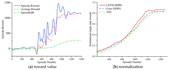 It is necessary to balance safety, traffic efficiency, and comfort in lane-change decisions of autonomous vehicles. The curve of the average reward value normalized by a single step in the training process is smoothed, and the change curve is shown in Figure 4b. It can be observed that the reward value of the LSTM-DDPG algorithm gradually converges to 0.89 after about 1200 rounds of training. After about 1260 training rounds, the reward value of the Conv-DDPG algorithm gradually converges to 0.83. After about 1300 training rounds, the reward value of the TD3 algorithm gradually converges to 0.82. By comparison, it is found that the LSTM-DDPG algorithm has the fastest convergence speed, and the reward return is also improved.