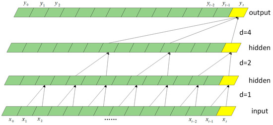 Dilated causal convolution can be divided into three parts: dilation, causality, and convolution. Convolution refers to a type of sliding operation performed by the convolution kernel on the data. Dilation refers to allowing interval sampling when convolving the input. Causality refers to the data at time t in the i-th layer, which only depends on the influence of the value at time t and before in the (i − 1)th layer. Figure 1 depicts the architectural diagram of the dilated causal convolution, with the k equal to 3 and the d set as [1, 2, 4].