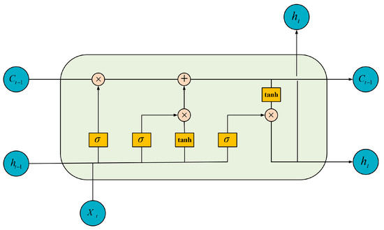 LSTM, a variant of a RNN, is distinguished by its incorporation of gates, namely the forget gate, memory gate, and output gate. These gates enable selective memorization or forgetting of specific portions of input data, preserving their historical states throughout computations. The fundamental architecture of LSTM is depicted in Figure 2, and the computational formulas for the propagation process are expressed in Equations (10)–(15).