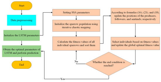 - Repeat Step (4) until the termination condition is met. Output the position of the optimal sparrow individual, that is, the best hyperparameter value, input the obtained parameters into the LSTM model, and use the trained prediction model for prediction.