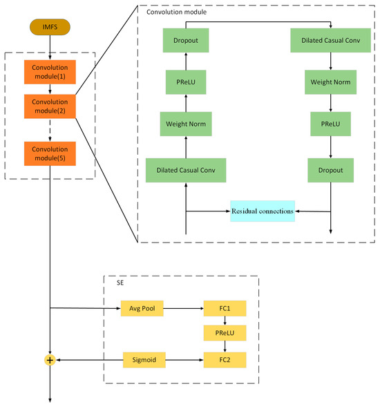 Following these convolutional modules, a Squeeze-and-Excitation (SE) module is incorporated. The SE module dynamically adjusts the weights of different channel features based on the loss function, enhancing the network’s ability to recognize key information from the input sequence and determine its priority. This improves the overall efficiency of the TCN module. The summation operation () ensures that the tensors remain consistent. The design of the TCN prediction model is illustrated in Figure 5.