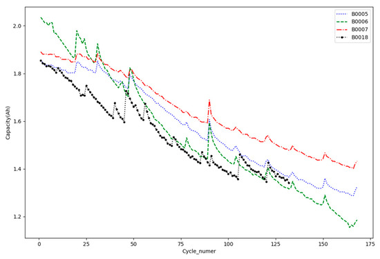 In battery experiments, it is generally accepted that the battery life is terminated when its current capacity reaches 70% of its rated capacity. Since the capacity of the B0007 battery did not drop below 1.4 Ah in the original dataset, for experimental rigor, the failure threshold for the B0007 battery was set at 1.5 Ah, while the other batteries were set at 1.4 Ah. In the dataset of CALCE, the failure threshold of the battery is 0.77 Ah.