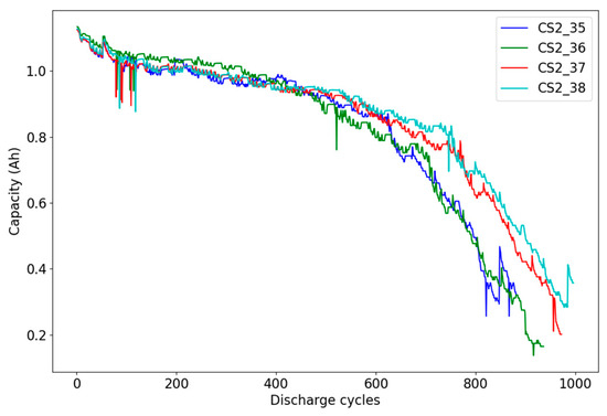 To validate the accuracy of the proposed prediction method, lithium-ion battery datasets from the National Aeronautics and Space Administration (NASA) and the Center for Advanced Life Cycle Engineering (CALCE) at the University of Maryland were selected. The NASA battery dataset includes experiments on four types of lithium-ion batteries: B0005, B0006, B0007, and B0018. All batteries have a rated capacity of 2 Ah. The experiments were conducted at room temperature (24 °C). During the charging process, a standard charging method was used, with a constant current of 1.5 A until the maximum cut-off voltage of 4.2 V was reached. Then, it switched to constant voltage charging until the charging current dropped to 20 mA, indicating the end of the charging process. During discharge, the constant current was 2 A, and when the voltage reached the respective discharge cut-off voltages of 2.7 V, 2.5 V, 2.2 V, and 2.5 V for each of the four batteries, the discharge ended. The CALCE dataset includes CS2_35, CS2_36, CS2_37, and CS2_38. These batteries were also charged with a constant current rate of 0.5 °C until the battery voltage reached 4.2 V, followed by a constant voltage mode until the battery current dropped below 0.05 A. The discharge process was a constant current discharge of 0.05 A until the voltage dropped to 2.7 V. Figure 7 depicts the capacity decline curves of the four sets of batteries from NASA. Figure 8 depicts the capacity decline curves of the four sets of batteries from CALCE.